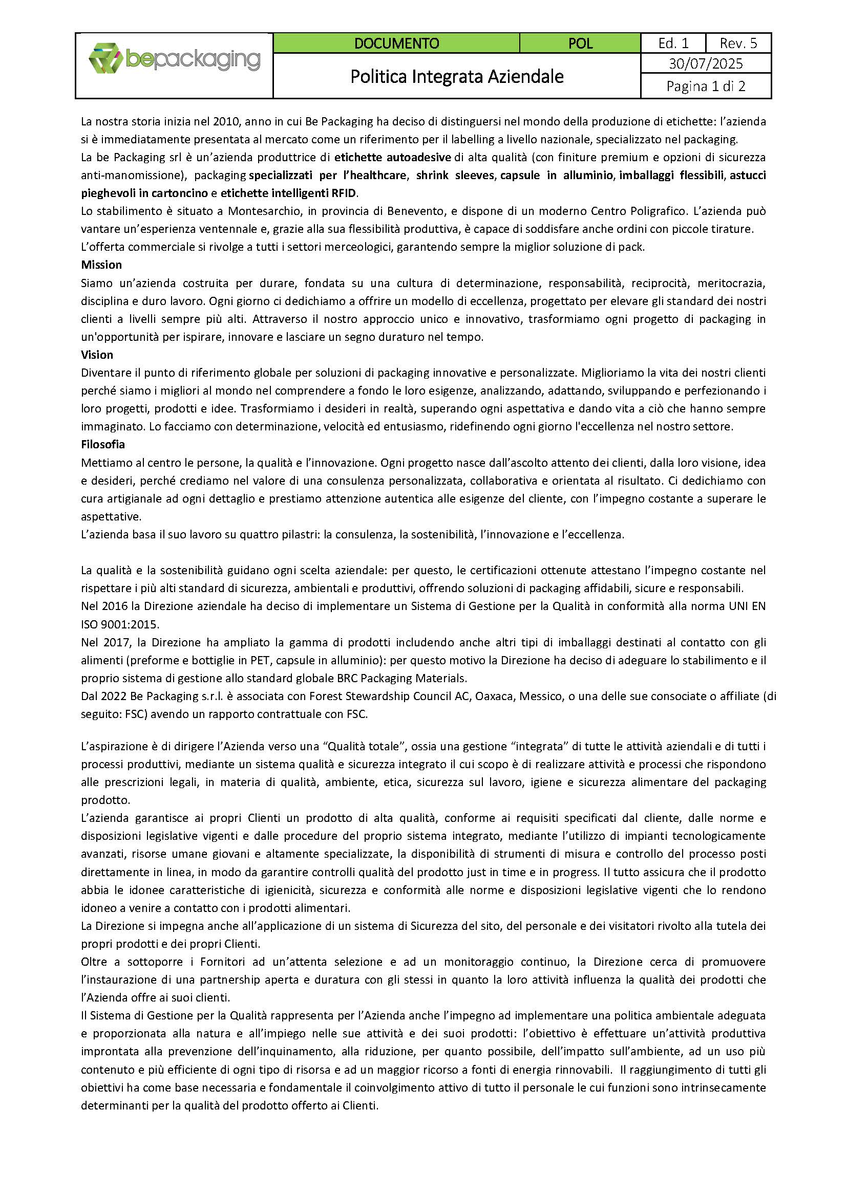 La nostra missione è elevare gli standard del packaging attraverso innovazione, consulenza personalizzata e attenzione artigianale ai dettagli. Mettiamo al centro persone, qualità e sostenibilità, operando con un sistema integrato certificato (ISO 9001, BRC Packaging Materials, FSC) che garantisce sicurezza, conformità e prestazioni eccellenti.